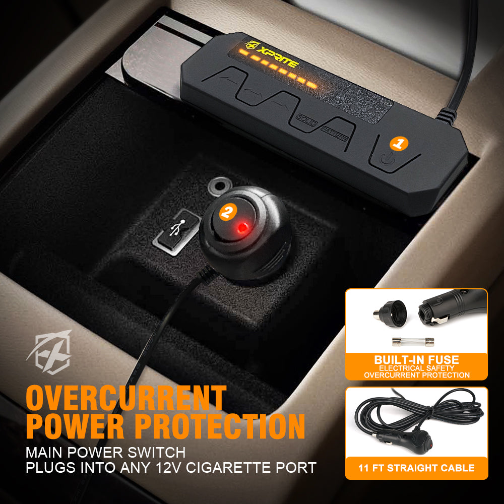 Fuente de alimentación: Puerto de cigarrillos de 12V.
